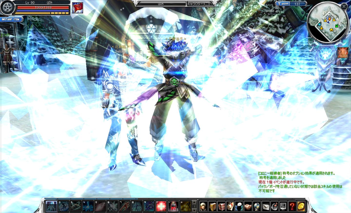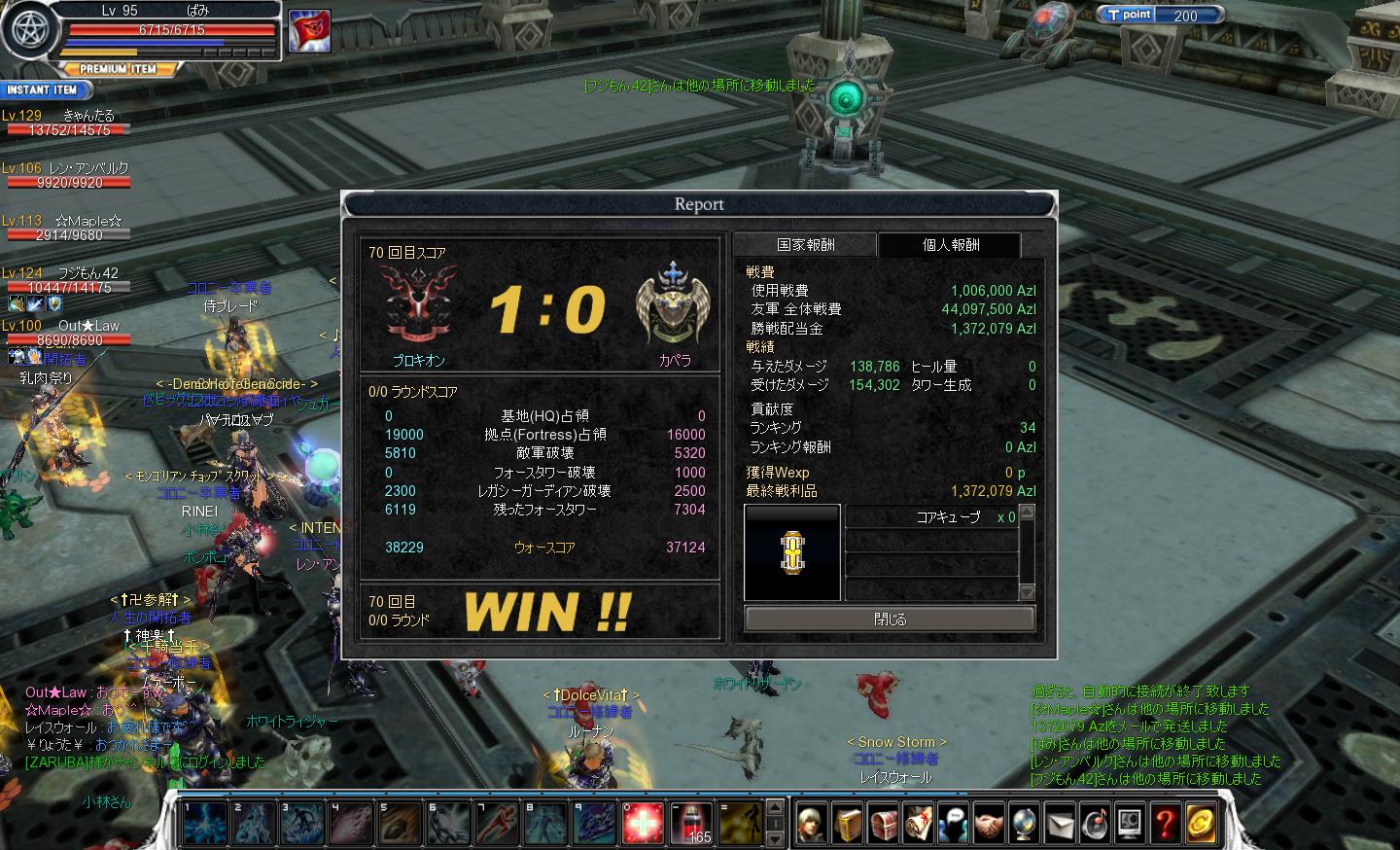 やっと95~の戦争に行けるようになりました ぃぇ━━━━ヽ(*゚∀゚)人(゚∀゚*)ノ━━━━ぃ♪ で、実際に行ってみると、三国無双4の占領拠点(?)みたいなタワーがあり どちらの勢力がいかに敵陣を崩していくかという深いものでしたw 結果は2戦1勝1敗^^; でもおもしろかった(・∀・)♪+.゚ あと、 Lv65になると1時間で2レベ上がる場所があるから それまでガンバ!!o(・ω・´o)(o`・ω・)o!!ガンバ